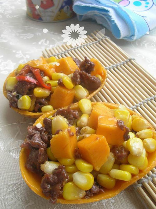 及以下步骤:倒入腌好的牛肉翻炒至7成熟,加入蚝油调味。 再倒入玉米芒果翻炒熄火上碟即可。 美味的牛肉玉米芒果船绝对是你餐上的选择! 摘出玉米粒。 放在锅开水中焯二分钟上,捞起待用。 芒果切开对半,再挖出肉粒,注意不要挖穿皮,外皮作船,用来装菜。 热锅热油爆香姜片蒜头红椒 倒入腌好的牛肉翻炒至7成熟,加入蚝油调味。 再倒入玉米芒果翻炒熄火上碟即可。 美味的牛肉玉米芒果船绝对是你餐上的选择!