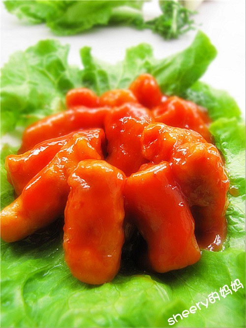 生粉(两小勺) / 盐(一小勺半) / 糖(一大勺) / 油(一大勺) / 水淀粉(一汤勺) / 鸡精(少许) / 白醋(适量) / 番茄酱(两大勺) / 酒(少许) / 水(适量) / 熟猪油(少许)