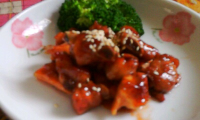 做法很简单,估计很多人都会做也都做过了~ 1:将剁好洗净的小肉排(带点肥肉的肉排比较好吃)混合淀粉和精盐,少许油搅拌好,1匙叉烧酱用适量的开水冲开备用。 2:起锅下少许花生油爆香蒜片(我用带肥肉的排骨,不需要太多油下锅) 3:把腌制了的小肉排下锅爆到出油呈金黄色(因本人买的肉排肥腻,油多就沥去一些了) 4:倒入混合了开水的叉烧酱汁下锅,翻炒肉排,如汁多可盖上锅盖稍微焖几分钟至汤汁稠结,收汁时翻炒排骨沾汁均匀装盘,撒上些白芝麻~