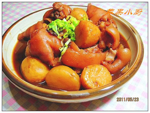 及以下步骤:锅中放少量油,加入猪蹄翻炒一会,加入干红椒、八角、料酒炒上色。 猪蹄切成小块,加入老抽、料酒、葱、姜腌渍十分钟以上。 锅中放少量油,加入猪蹄翻炒一会,加入干红椒、八角、料酒炒上色。 猪蹄切成小块,加入老抽、料酒、葱、姜腌渍十分钟以上。 锅中放少量油,加入猪蹄翻炒一会,加入干红椒、八角、料酒炒上色。 猪蹄切成小块,加入老抽、料酒、葱、姜腌渍十分钟以上。 锅中放少量油,加入猪蹄翻炒一会,加入干红椒、八角、料酒炒上色。 加入小土豆炒至猪蹄表面发黏。 加入适量的开水,转入电压力锅,放入红枣、盐、糖、老抽调味,保压十五分钟后即可。 出锅后放少许青菜丝点缀。