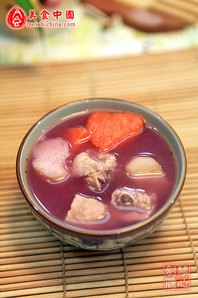 及以下步骤:大薯去皮也切成大块。 将排骨洗净切段、胡萝卜去皮切大块,马蹄去皮。 大薯去皮也切成大块。 将排骨洗净切段、胡萝卜去皮切大块,马蹄去皮。 大薯去皮也切成大块。 将排骨洗净切段、胡萝卜去皮切大块,马蹄去皮。 大薯去皮也切成大块。 将排骨、胡萝卜、马蹄入锅加水烧开,文火煮40分钟。 加入大薯,再煮10分钟就行了,因为大薯容易煮烂,所以要后加。 煮好的汤,颜色挺好的,嘿嘿。