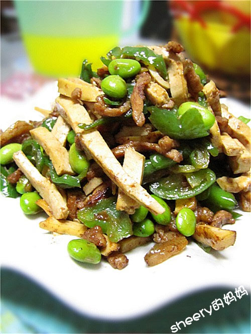 及以下步骤:毛豆米变色后倒入辣椒丝。 倒进豆腐干和肉丝。 加糖、盐、鸡精调味。 翻炒两下就行了。 锅内再放点油。 下毛豆米翻炒。 毛豆米变色后倒入辣椒丝。 倒进豆腐干和肉丝。 加糖、盐、鸡精调味。 翻炒两下就行了。