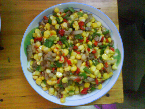 及以下步骤:切好的玉米粒。 一小块五花肉剁的肉沫,剁得一点儿都不碎,呵呵.....青椒红椒各二根.也要切成一粒一粒的.最后切点蒜粒。 切好的玉米粒。 一小块五花肉剁的肉沫,剁得一点儿都不碎,呵呵.....青椒红椒各二根.也要切成一粒一粒的.最后切点蒜粒。 切好的玉米粒。 一小块五花肉剁的肉沫,剁得一点儿都不碎,呵呵.....青椒红椒各二根.也要切成一粒一粒的.最后切点蒜粒。 锅烧热后倒些油(油不要太多了哦,不然感觉很腻),油六七成热时倒入五花肉沫,翻炒至有香味。 香味出来了,再倒入蒜粒、青椒粒、红椒粒再翻炒(有汽,好模糊哦~呵)。 接着倒入切好的玉米粒翻炒至变色,玉米不要炒得太久了哦,很容易熟的,变色了就好了。 最后加盐就可以出锅啦~!..味精都不用了,这样才能体现原汁原味嘛............哇卡卡。