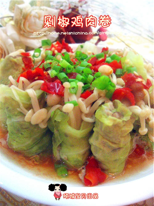 及以下步骤:大盆中,依次放入鸡肉蓉、香菇丁、葱姜末,调入盐、淀粉、白糖、料酒、香油,加入少许泡香菇的水。 顺着一个方向,搅拌均匀,成鸡肉馅,备用。 取一片长方形的包菜叶,平铺在案板上。 在叶片上均匀的抹上一层鸡肉馅。 如图所示,在一端横放上几跟金针菇。 卷起,成鸡肉卷。直立放入盘中。 一一卷好。 放入蒸锅,隔水蒸15分钟。 蒸肉卷的同时不能闲着,剁椒里放入鸡精、一勺生抽拌匀,香葱切葱花,备用。 可以大吃特吃喽。