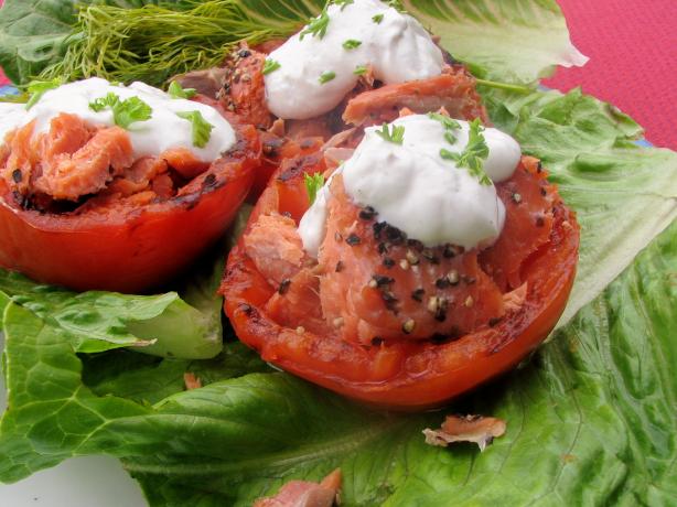 及以下步骤:混合酸奶油,香葱,莳萝,加盐、胡椒粉、酒和辣椒粉,备用。 将炭火点燃,准备好烤架。 混合酸奶油,香葱,莳萝,加盐、胡椒粉、酒和辣椒粉,备用。 将炭火点燃,准备好烤架。 混合酸奶油,香葱,莳萝,加盐、胡椒粉、酒和辣椒粉,备用。 将炭火点燃,准备好烤架。 混合酸奶油,香葱,莳萝,加盐、胡椒粉、酒和辣椒粉,备用。 将西红柿切成两半。用勺子把西红柿内瓤掏去一大部分,并撒上盐。 把番茄切面朝下放在烤架上,5分钟后把西红柿翻面。将黄油加入到西红柿腔里 等到黄油融,从烤架上取下。 添加2大匙熏三文鱼和2,继续烤1—2分钟。撒上切碎的香菜即可。