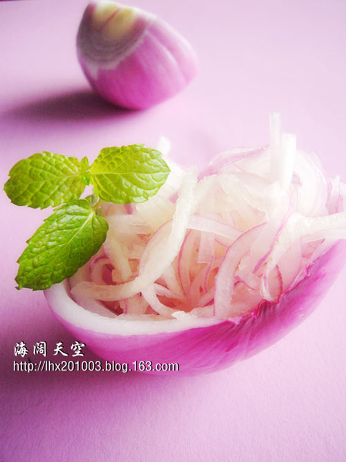 3、将洋葱切丝,越薄越好薄如纸最好啦。