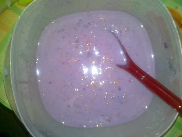 3、冲一杯牛奶,凉了,倒入芒果和紫薯一起搅拌。