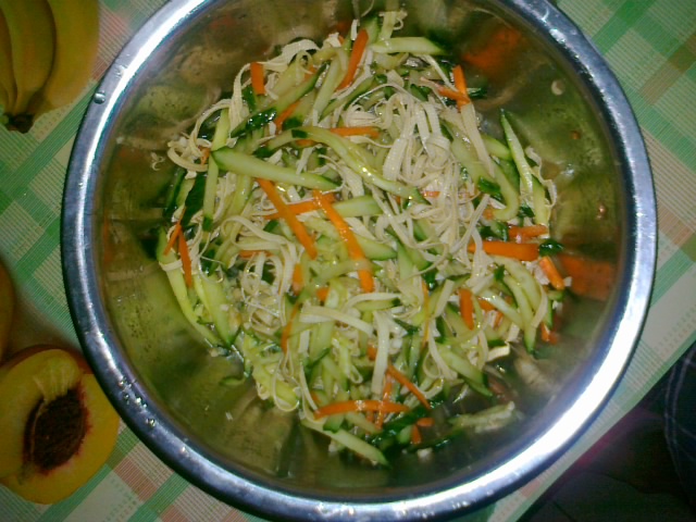 胡萝卜(250克) / 黄瓜(2个) / 粉丝(400克) / 干豆腐(2张) / 豆芽(300克)
