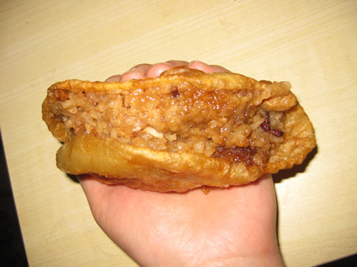 及以下步骤:面粉过筛,加入开水用筷子搅拌成小块的面团。 面放凉后,揉成光滑面团,醒发15分钟。 面团分成小剂子,擀成3mm厚的面饼。 放入油锅炸至变色就可捞出。 炸好的油饼一半铺上香糯的米糕。 饼子对折,将米糕包在饼中,就可以开吃啦。 面团分成小剂子,擀成3mm厚的面饼。 放入油锅炸至变色就可捞出。 炸好的油饼一半铺上香糯的米糕。 饼子对折,将米糕包在饼中,就可以开吃啦。