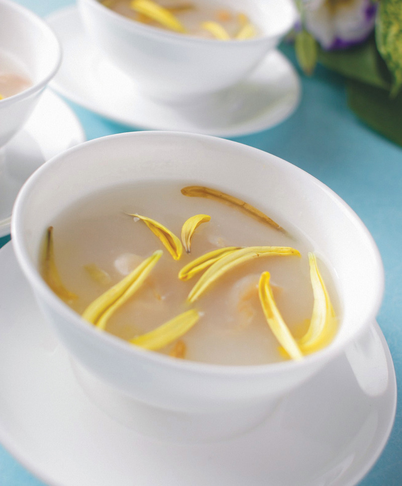 4、撒上咸菜、花生粒、菊花瓣即可奉客。