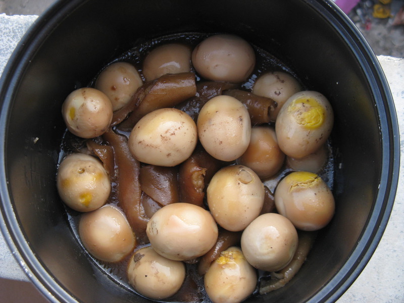 7、猪皮刮毛,我用火烧的,鸡蛋煮好去壳,用筷子在捅一下,好入味,烧开水加入所有配料,炖40分钟,冷却后开工咯,我喜欢多放几个鸡蛋,冷后放冰箱里卤到第三天更入味。
