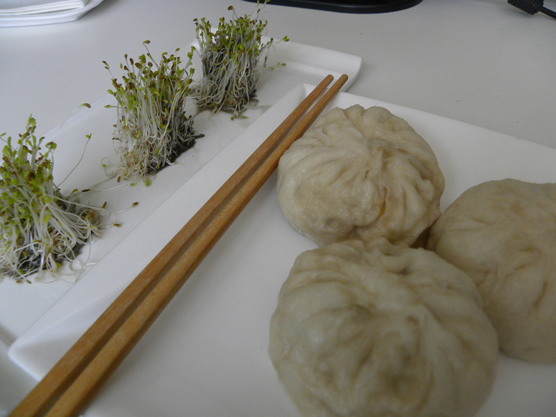 味道香、鲜、嫩。包子中的天贝和香菇提供很好的氨基酸来源,但是维生素稍微缺乏一些,那配了一碟自己发的苜蓿芽,补充优质维生素和矿物质。搭配起来均衡可口。芽苗中间用芝麻酱做芯,嘿嘿。