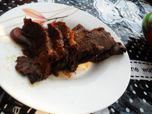 4、肉切大块加所有作料和花椒水(去掉花椒)放入冰箱腌制12小时以上(我曾经腌过24小时),充分入味。(我是头天晚上腌的,第二天晚上做的,看看照片就知道啦,光线不好。)