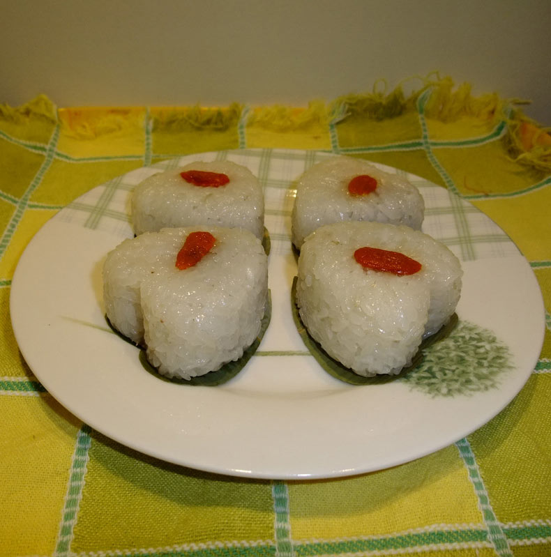 6、先做甜陷的。舀一汤勺糯米放在保鲜纸上,包成圆球形(跟肉丸子大小差不多),摊开,再覆上一层保鲜纸,用平板的东西将其压成圆形状(就跟菜饺子皮一样),然后将适量蛋黄,黄豆沙,红豆沙放在中间,像包汤圆一样包成圆球形,在正面处放置一颗枸杞,再将圆球形放入心形边框,压成心形,放置在心形粽叶上。侧围/上面再覆盖粽叶,用草绳扎紧即成。(这整个过程都是隔着保鲜纸操作,手是不用碰到食材的)