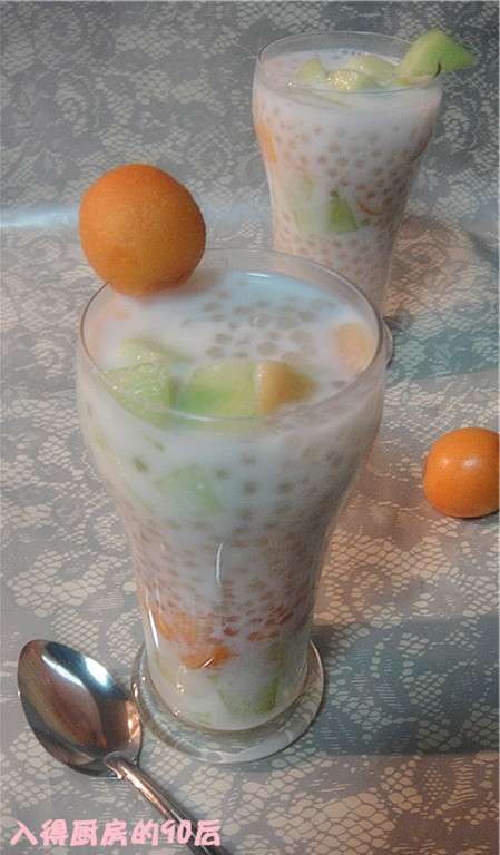 炼乳(适量) / 甜瓜(适量) / 小西米(适量) / 枇杷(适量) / 冰镇过的椰汁(适量)