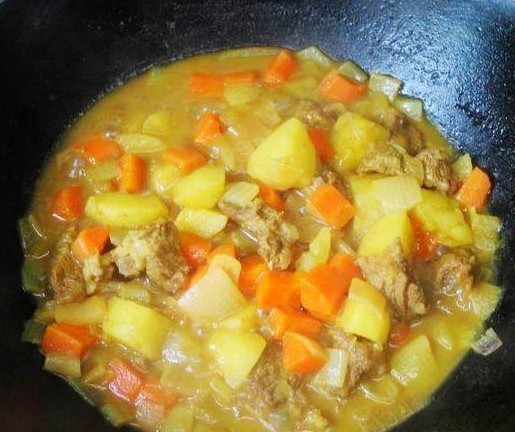 3、锅内放油,6成热的时候放入胡萝卜和土豆煸炒一会,之后加入刚才煮牛肉的清汤和牛奶,再加入适量的咖喱块盖上锅盖煮30分钟。中间要不时的搅动,以免咖喱沾到锅底。