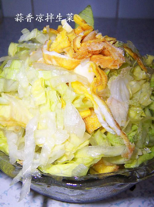 及以下步骤:把蛋皮丝放入生菜上。 倒入碗汁。 搅拌均匀即可。 鸡蛋打散。 放入煎锅煎至成蛋皮。 把煎好的蛋皮切成丝。 取一碗加入蒜碎 香油 醋 盐 鸡精 搅拌均匀。 把蛋皮丝放入生菜上。 倒入碗汁。 搅拌均匀即可。