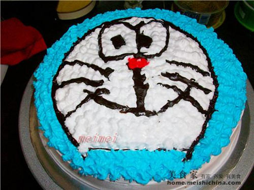 及以下步骤:放入预热好的烤箱, 180°c,40分钟。 (个人烤箱温度不同,注意调整温度和时间) 鲜奶油打法,一份加入可可粉打成巧克力奶油,另一份备用。 取1片蛋糕片,抹上一层厚厚的巧克力奶油馅。 放上第2片蛋糕片。 把打法的鲜奶油涂抹蛋糕表层即可。 首先用牙签在蛋糕上划出轮廓,再把巧克力溶化画上清晰图案。 食用蓝色素调入奶油装入裱画袋,将挤出的奶油根据线条裱在蛋糕体。另一份鲜奶油装入裱画袋一样做法。 用一点奶油调红色做鼻子。适量的溶化巧克力描上轮廓就大告功成啦。 成品图@@多啦a梦~~~~~来啦。 成品图@@多啦a梦~~~~~来啦。