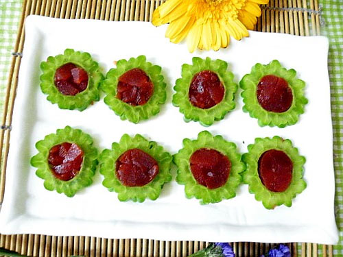 及以下步骤:苦瓜洗净切两半,用小勺把掏出内瓤。 放开水煮一下。 苦瓜洗净切两半,用小勺把掏出内瓤。 放开水煮一下。 苦瓜洗净切两半,用小勺把掏出内瓤。 放开水煮一下。 立刻放入冷水浸泡。 山楂糕切碎。 姜山楂糕塞入苦瓜肚内,要压实,可用筷子。 可冷藏一会切成片,装盘。