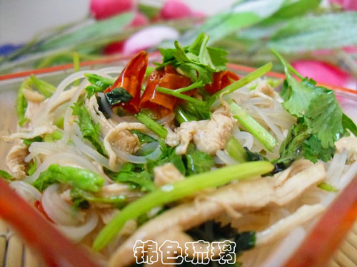 及以下步骤:香菜切段,倒入锅内,翻炒一分钟后盛出。 碗内放适量醋,盐,少许生抽,将第七步材料放进去搅拌均匀。 鸡肉在开水中煮三分钟,捞出撕成细丝。 将所有材料放在一个容器里,搅拌均匀即可。 蒜瓣切成末。 锅底放适量油,将蒜和红椒小火爆香。 香菜切段,倒入锅内,翻炒一分钟后盛出。 碗内放适量醋,盐,少许生抽,将第七步材料放进去搅拌均匀。 鸡肉在开水中煮三分钟,捞出撕成细丝。 将所有材料放在一个容器里,搅拌均匀即可。