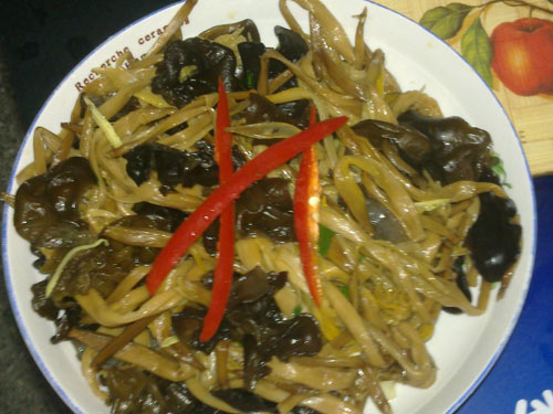 及以下步骤:拌匀即可。 木耳、黄花菜加冷水泡发20分钟。 将泡好的木耳去蒂冼净撕成小片,黄花菜去掉老根。 木耳、黄花菜加冷水泡发20分钟。 将泡好的木耳去蒂冼净撕成小片,黄花菜去掉老根。 木耳下入沸水中焯2分钟。 再将黄花菜放入沸水中烫熟。 加入盐、鸡精、香油拌匀。 炒锅放少许油将葱、姜丝爆香,浇至菜肴上。 拌匀即可。