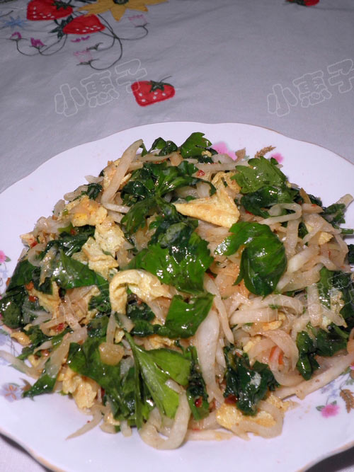芹菜叶可是个好东东,我平时炒芹菜时,叶子从不扔,也有营养。今用嫩芹菜叶来凉拌萝卜丝,相当清爽、爽口,是夏天一款简单的菜肴。