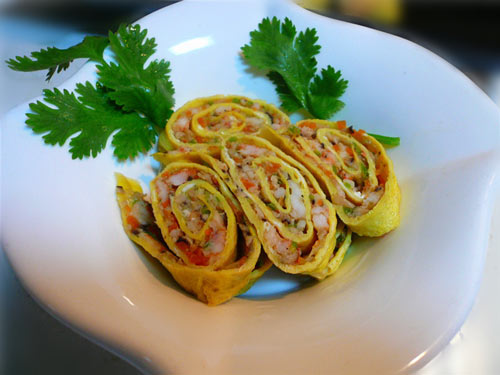 制作美食美味虾茸蛋卷。
