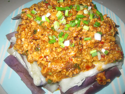 7、将炒好的鸡松酱浇在茄子上,在淋上香油即可。
