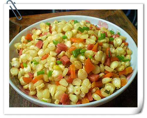 及以下步骤:玉米全部剥下来洗净,胡萝卜切丁和玉米一起在沸水中煮5分钟捞出沥干备用。火腿肠切丁,葱姜切细备用。 热锅热油爆香葱姜。 玉米全部剥下来洗净,胡萝卜切丁和玉米一起在沸水中煮5分钟捞出沥干备用。火腿肠切丁,葱姜切细备用。 热锅热油爆香葱姜。 玉米全部剥下来洗净,胡萝卜切丁和玉米一起在沸水中煮5分钟捞出沥干备用。火腿肠切丁,葱姜切细备用。 热锅热油爆香葱姜。 倒入沥干的玉米和胡萝卜丁。 翻炒1分钟后倒入火腿肠丁。 全部翻炒均匀,再炒1-2分钟。 加少量盐,椒盐,撒上小葱就可以出锅了。