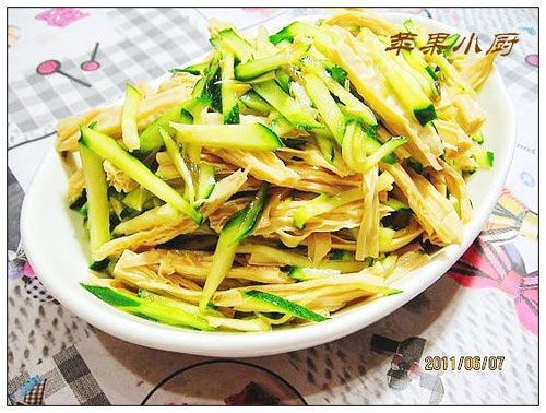 及以下步骤:腐竹泡发后切成细丝,用沸水再烫五分钟。 黄瓜切成细丝。 腐竹泡发后切成细丝,用沸水再烫五分钟。 黄瓜切成细丝。 腐竹泡发后切成细丝,用沸水再烫五分钟。 黄瓜切成细丝。 加入葱油。 加入花椒油。 加入蚝油和适量盐。 拌匀即可食用。