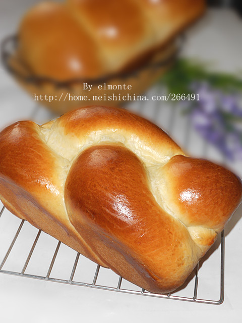 及以下步骤:另外3份面团,分别擀成长条形,撒上葡萄干。 沿宽边卷起来,收口捏紧,搓长。 把3条面条一端捏紧。 编成辫子状。 放入土司模里,盖上保鲜膜,二次发酵至2倍大。 刷上鸡蛋液。 放入预热了350f/180c度的烤箱,烤30分钟。20分钟上色后,盖上锡箔纸,防止烤糊了。 出炉后立即脱模。 柔软而q, 小孩子喜欢撕着吃。 柔软而q, 小孩子喜欢撕着吃。