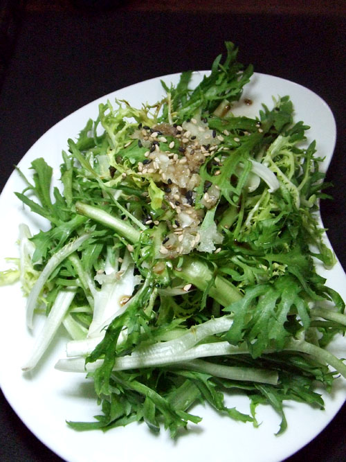 3、苦菊放入盘中,放上蒜末,淋上糖醋汁儿即可。