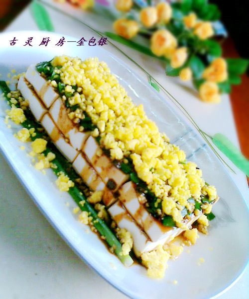及以下步骤:在豆腐上撒上一些焯熟的韭菜末便于增加香味。 均匀淋上先前准备好的调料。 再把咸蛋黄末均匀的撒在韭菜末上。 捞出放入事先准备好的凉开水中冷却。 把咸蛋黄用汤勺碾碎。 把上述所有调料搅拌均匀静置一会,让其充分融合。 把煮好的豆腐摆好盘。 在豆腐上撒上一些焯熟的韭菜末便于增加香味。 均匀淋上先前准备好的调料。 再把咸蛋黄末均匀的撒在韭菜末上。