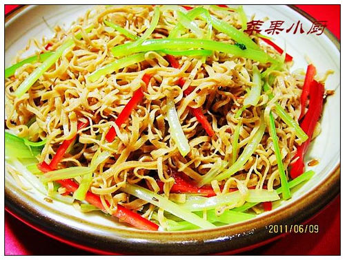及以下步骤:入180度的油锅中,炸至变干。 豆皮切成细丝,越细越好。 入180度的油锅中,炸至变干。 豆皮切成细丝,越细越好。 入180度的油锅中,炸至变干。 豆皮切成细丝,越细越好。 入180度的油锅中,炸至变干。 加入老汤中,慢火炖煮。 当脆脆的豆丝完全变软,捞出沥汤汁放入盘中,倒入一勺葱油,一勺花椒油。 加入芹菜丝、红椒丝拌匀即可。