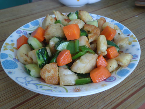 4、最后一步,关键,把切好的黄瓜丁、胡萝卜丁及青椒等烧油入锅。翻炒至5分熟,加入烧好的花卷丁,调味,起锅入盆。大功告成。绝对是低成本高营养的主食午餐。