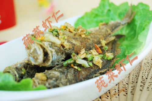 小黄鱼体小而鳞片大,嘴尖,主要分布在渤海、黄海和东海。小黄鱼肉嫩且多,肉呈蒜瓣状,刺少,味鲜美。其肉质鲜嫩,营养丰富,是优质食用鱼,也是婴幼儿及病后体虚者的滋补和食疗佳品。此菜系将小黄鱼宰杀洗净,加调料腌渍后,油炸至脆,再放入蒜茸、花椒盐等颠翻而成。成菜后,香脆味鲜,鱼肉细嫩,香酥可口。