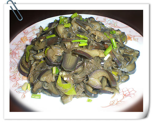 及以下步骤:中火慢炖,将水收干,加盐,五香粉。 撒少量的小葱就可以出锅了。 茄子洗净,切片备用。 粉条洗净泡软备用。 锅内不放油,烧热锅,倒入茄子,煸炒至软。 将茄子炒软。 将炒软的茄子推至一边,放一块荤油融化后倒入姜片和青椒。 将茄子和青椒翻炒均匀后倒入粉条,并加入半碗水。 中火慢炖,将水收干,加盐,五香粉。 撒少量的小葱就可以出锅了。