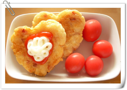 及以下步骤:可以加沙拉酱、番茄酱调调味儿。 搭配几颗圣女果,就着冰冻椰汁开吃吧! 热狗肠。 速冻薯条。 主角切小丁儿,加入用水和好的面糊里拌匀。 锅加油烧热,倒入适量的面糊在煎蛋模子里定型,煎的时候火不能太大。 分两次煎到两面金黄,这样表皮才香脆。提醒一下,煎蛋模子要先预热后再倒面糊哦,不然冷模下面糊会粘的。 煎好的薯饼摆在厨房纸上吸吸油。 可以加沙拉酱、番茄酱调调味儿。 搭配几颗圣女果,就着冰冻椰汁开吃吧!