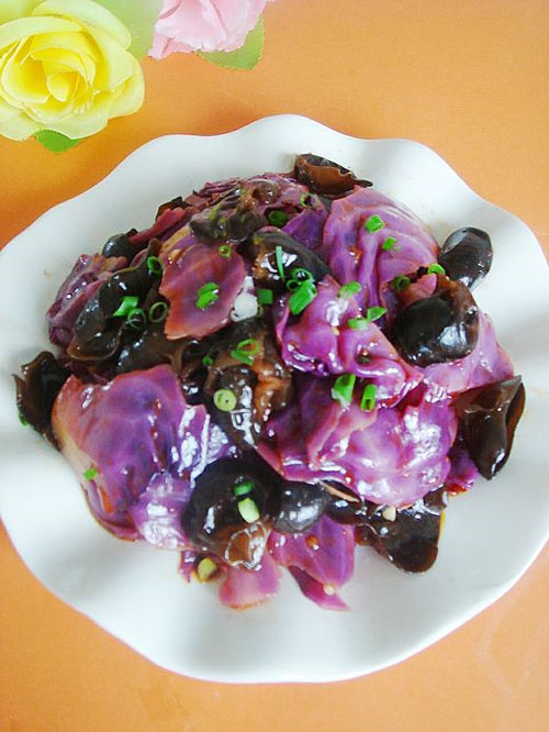 及以下步骤:调入适量的盐,辣椒油,香醋,香油拌匀成味汁。 将味汁烧在紫甘蓝木耳上拌去。 拌好的甘蓝码入盘内,撒上葱花即可。 锅里水开后放少许盐,下入紫甘蓝和木耳焯断生捞出过冷河备用。 葱切花,蒜切末。 滤干水的甘蓝木耳放入大的窗容器里。 小碗里放入蒜末,鸡粉,一汤匙豆豉。 调入适量的盐,辣椒油,香醋,香油拌匀成味汁。 将味汁烧在紫甘蓝木耳上拌去。 拌好的甘蓝码入盘内,撒上葱花即可。