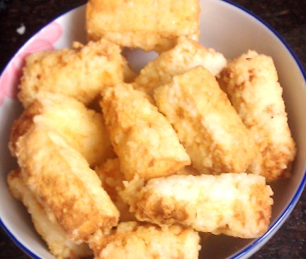 及以下步骤:2.裹上地瓜粉,用手轻轻捏实(是为了防止炸的过程地瓜粉脱落) 1.豆腐用淡盐水浸泡十分钟,沥干水份,切成小长方块 2.裹上地瓜粉,用手轻轻捏实(是为了防止炸的过程地瓜粉脱落) 1.豆腐用淡盐水浸泡十分钟,沥干水份,切成小长方块 2.裹上地瓜粉,用手轻轻捏实(是为了防止炸的过程地瓜粉脱落) 1.豆腐用淡盐水浸泡十分钟,沥干水份,切成小长方块 2.裹上地瓜粉,用手轻轻捏实(是为了防止炸的过程地瓜粉脱落) 1.豆腐用淡盐水浸泡十分钟,沥干水份,切成小长方块 2.裹上地瓜粉,用手轻轻捏实(是为了防止炸的过程地瓜粉脱落) 3.下油锅大火炸,直到表面出现金黄色外皮为止