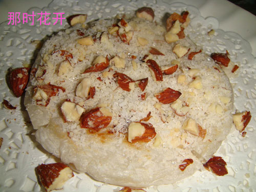 及以下步骤:起锅趁热切开。(可以省略,不切) 装盘撒杏仁馅即可。 准备的食材。 把杏仁用擀面杖碾碎。 把杏仁碎和适量椰蓉混合,放入微波炉里叮1分钟,倒入少许白糖拌匀。(30秒拿出搅拌一下) 糯米粉加适量的清水调匀成糊状。 把调好的糯米糊,倒在烧热的不粘锅里。(我没给油) 小火煎成薄饼。(很快,熟了的饼会鼓起来) 起锅趁热切开。(可以省略,不切) 装盘撒杏仁馅即可。