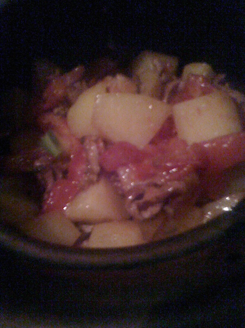 7、热油锅内下姜片,再入腌好的肉同炒,肉变色后加番茄,翻炒片刻后放土豆同炒,加酱油,盐。