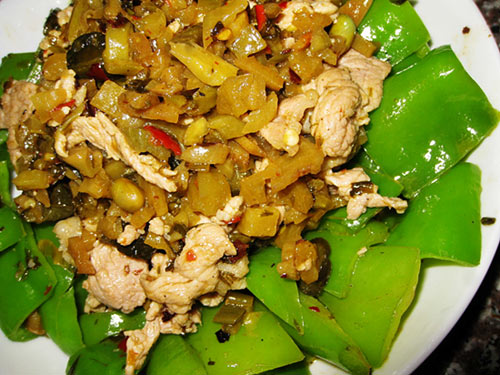 5、倒入外公菜一起翻炒片刻,加适量鸡精调味即可。