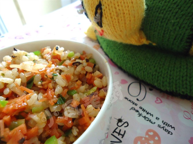 及以下步骤:胡萝卜、香菇、青椒切丁,葱切碎。 热锅凉油,放入几颗花椒(我喜欢吃麻,不喜可省略),炒香后捞出。 胡萝卜、香菇、青椒切丁,葱切碎。 热锅凉油,放入几颗花椒(我喜欢吃麻,不喜可省略),炒香后捞出。 胡萝卜、香菇、青椒切丁,葱切碎。 热锅凉油,放入几颗花椒(我喜欢吃麻,不喜可省略),炒香后捞出。 胡萝卜、香菇、青椒切丁,葱切碎。 热锅凉油,放入几颗花椒(我喜欢吃麻,不喜可省略),炒香后捞出。 .锅内放葱花,炒香后放入胡萝卜、青椒、香菇丁爆炒,期间加入蚝油、少许盐、少许糖调味。 最后加入米饭翻炒片刻出锅。
