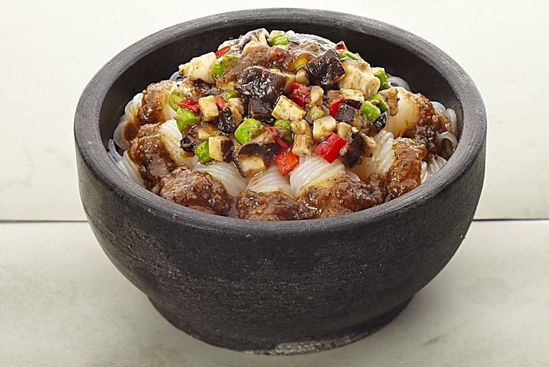 2、香菇、红辣椒和芦笋切碎,一起下锅热油炒熟,放入魔芋粉上,淋入香菇酱即可