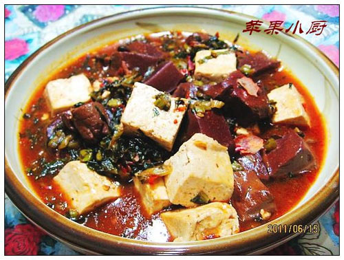 双色豆腐,血豆腐我用的是羊血,比较喜欢羊血,较猪更为嫩滑,而且没有腥膻的味道,配上绿生生的雪菜,味道相当不错。此菜微辣咸香,具有补钙、补血、排毒之功效。