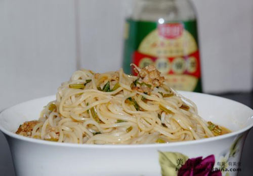 7、待面条熟后捞出盛在碗中,把炒好的绍子浇在面上,拌匀开吃。