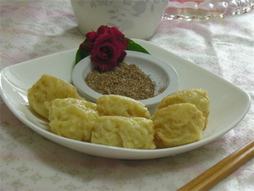 5、锅加油烧热,逐个放入丸子油锅中,炸成金黄色捞出,配椒相食用。