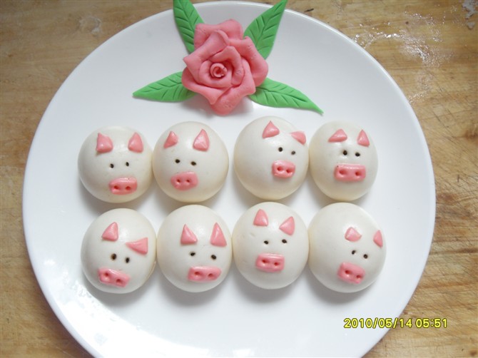 及以下步骤:面粉和鸡蛋糖酵母调成发面团。 一部分面用红食色调匀。 面粉和鸡蛋糖酵母调成发面团。 一部分面用红食色调匀。 面粉和鸡蛋糖酵母调成发面团。 一部分面用红食色调匀。 面粉和鸡蛋糖酵母调成发面团。 一部分面用红食色调匀。 做成福猪形。 醒好后蒸10分钟。