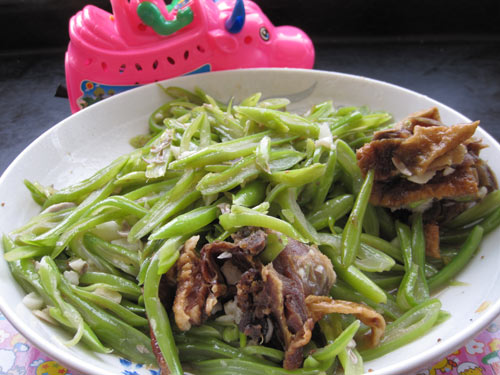 这个烤鸭是前几天买的吃剩的,都干巴了,所以放在炒的芸豆里面烩一下,既增加勒芸豆的美味,又使烤鸭变得软和。